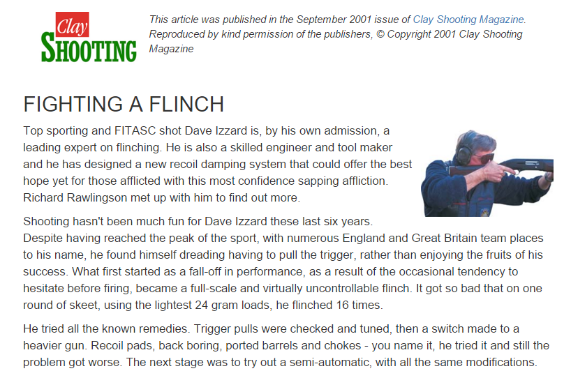 Like all physical sports involving impact or impulse, there are methods to minimise the risk of injury. In the absence of defined criteria we must take a common sense approach and consider all aches and pains as being early warning signs of something we are doing wrong in shooting. Appropriate action must be taken sooner rather than later and, certainly, a proper gun mount and stance can make an immediate improvement in comort.